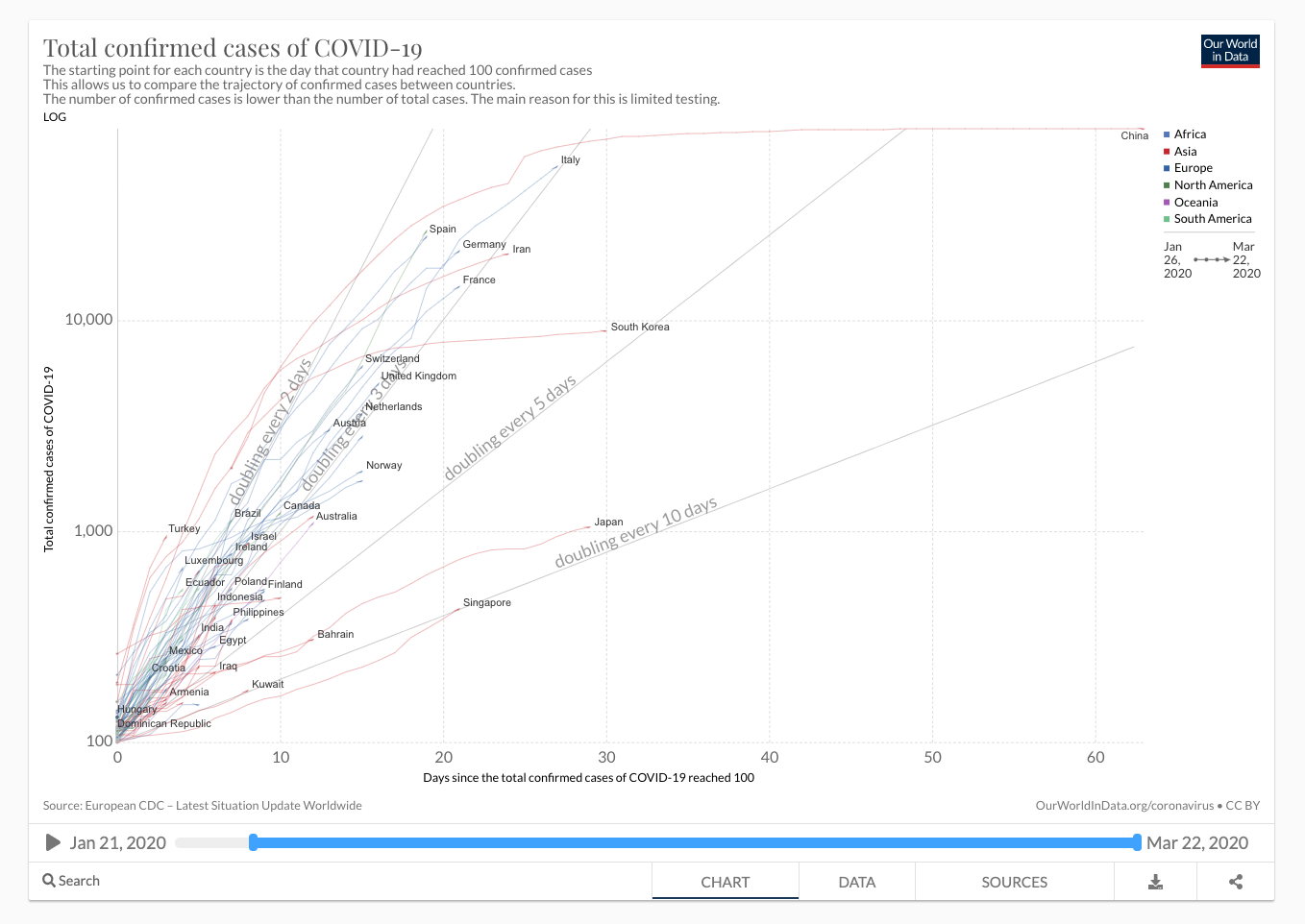 At a country level, we can all watch the numbers. This is my current ‘favourite’ graph because it shows how countries are tracking in terms of infection rates, giving an idea of how well management mechanisms are working. https://ourworldindata.org/grapher/covid-confirmed-cases-since-100th-case I have pasted today’s image below – the day New Zealand hit the 100 cases so we get to be on the graph.