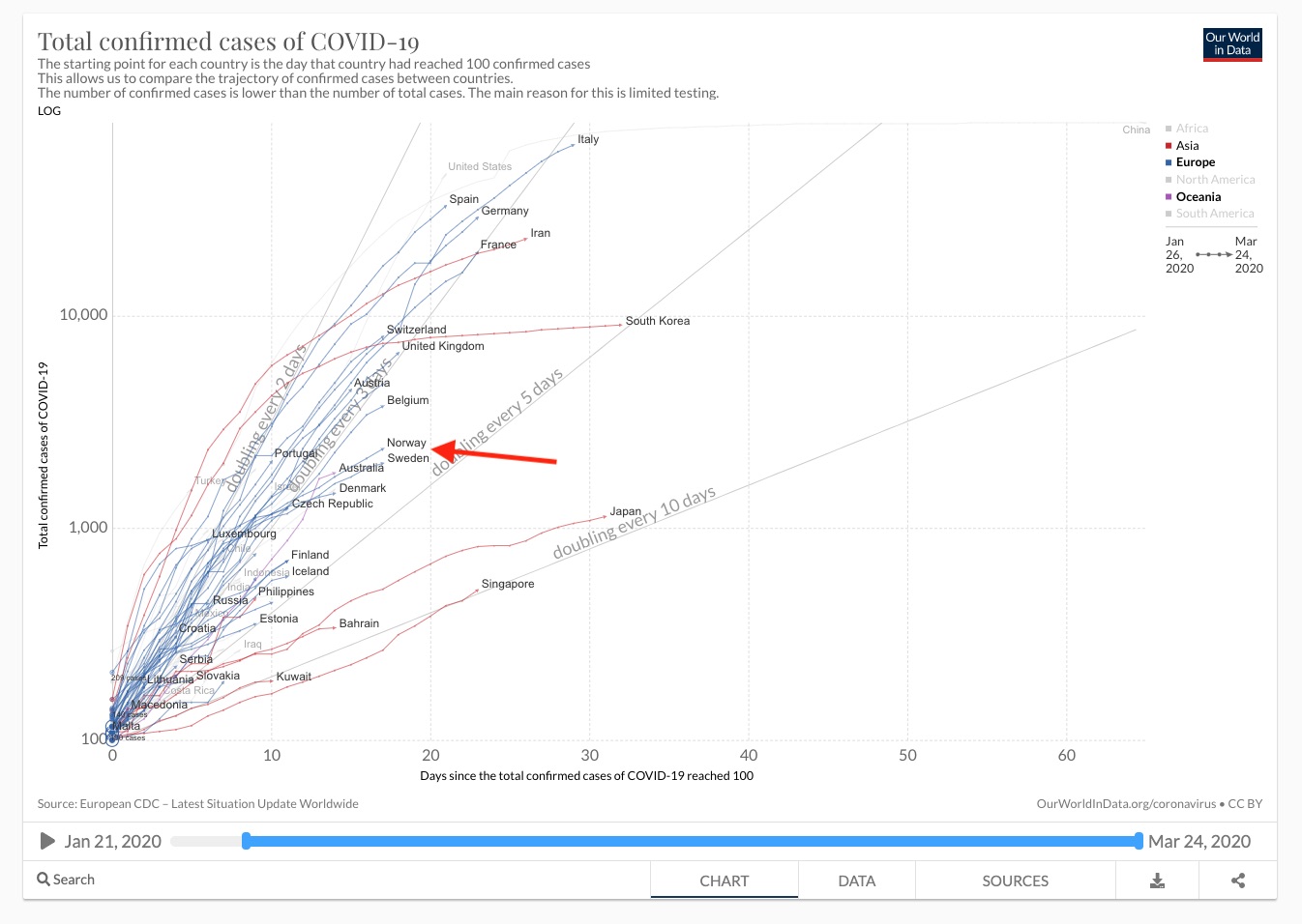 I am making a huge assumption that Norway and Sweden have many environmental, social and healthcare similarities so make for a good comparison (please let me know if you think this is a mistake). Therefore, here’s the graph of how Norway and Sweden are tracking on their confirmed COVID-19 cases – they are currently looking pretty similar; the experiment is going to need to run for longer as there is general unanimity that two weeks is the starting point for seeing a difference, based on the effects of large scale physical distancing. The only difference of any note is that Sweden’s death rate is starting to outpace Norway’s (62 vs 14 today, up from 11 vs 2 the day before). I should also note that I am in no way here intending to criticise our government’s choice of actions, what I am wanting to do is observe other experiments to see how they go in comparison with each other, and with us, always remembering that each experiment has its own unique conditions.
