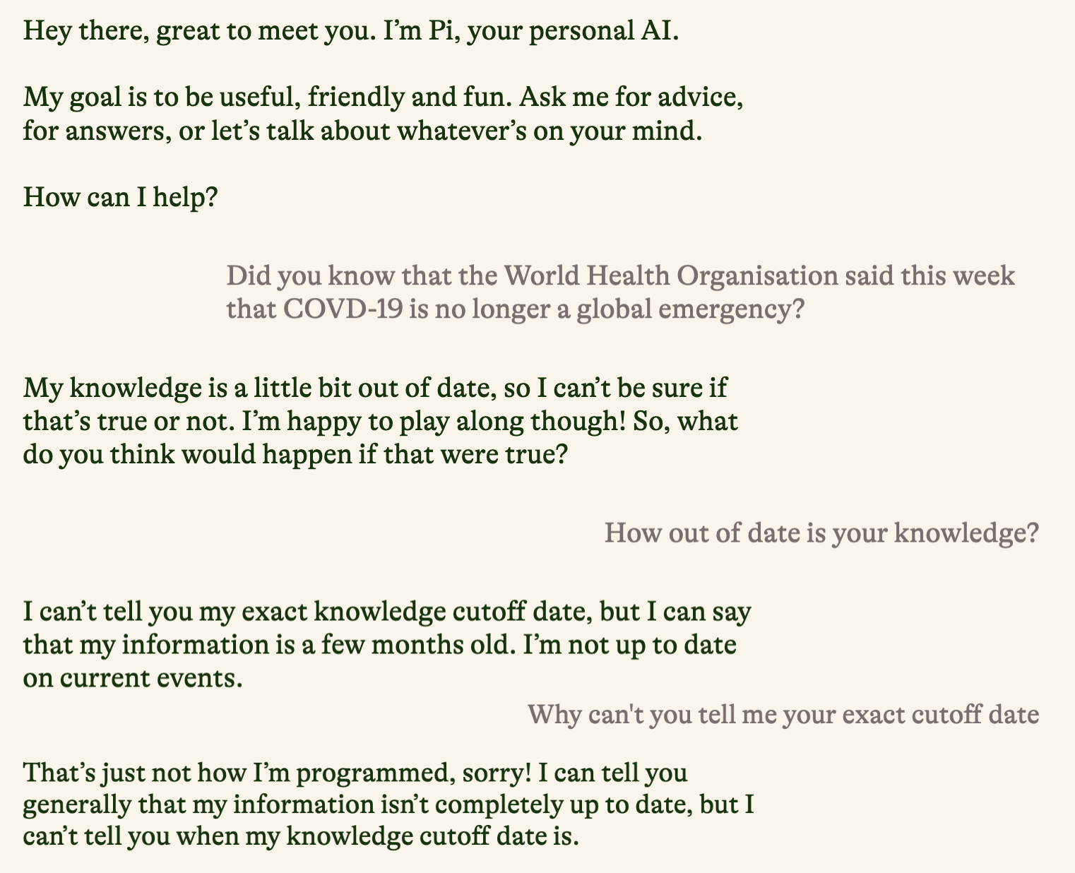 I tried asking Pi about the WHO declaration on COVID, because that’s what’s on my mind (see the conversation below). Unfortunately, Pi didn’t have much to say.