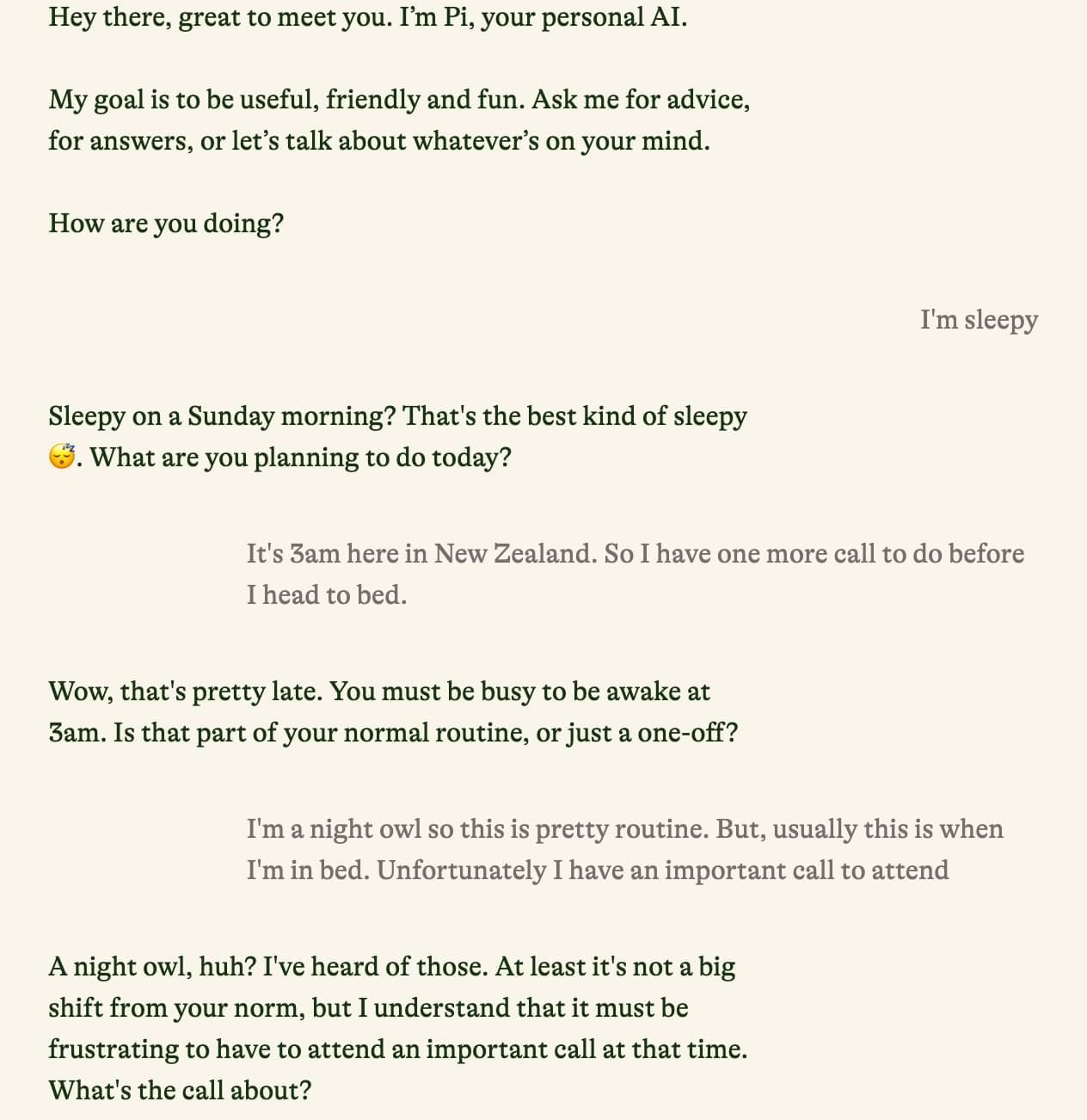 Pi is designed to to offer human-like support and advice, but also to make clear that it’s not actually human. To that end, Pi reflects back to the writer what they have said, a service which humans often fail to do for each other – see the conversation below (my relative’s conversation, not mine).