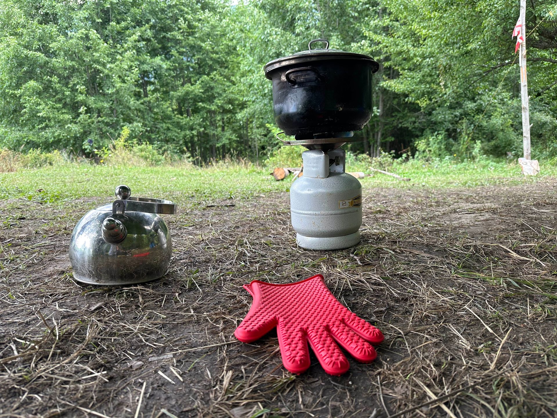 I messaged the network of 2023 TCT volunteers to tell them that the camp cooker(s) were unreliable if the remaining crews wanted to bring their own stoves as back-up. People expressed sympathy, and nervousness, about the fires. Then a woman from Crew 1 said they had the same experience with the cooker. She had turned the knob off with the silicon cooking glove before the flames became impossible. Cooking glove? We hadn’t seen a cooking glove. Crew 1 had also figured out to ensure the stove was tightened on the cylinder every use because that’s where they thought the gas leak came from.
