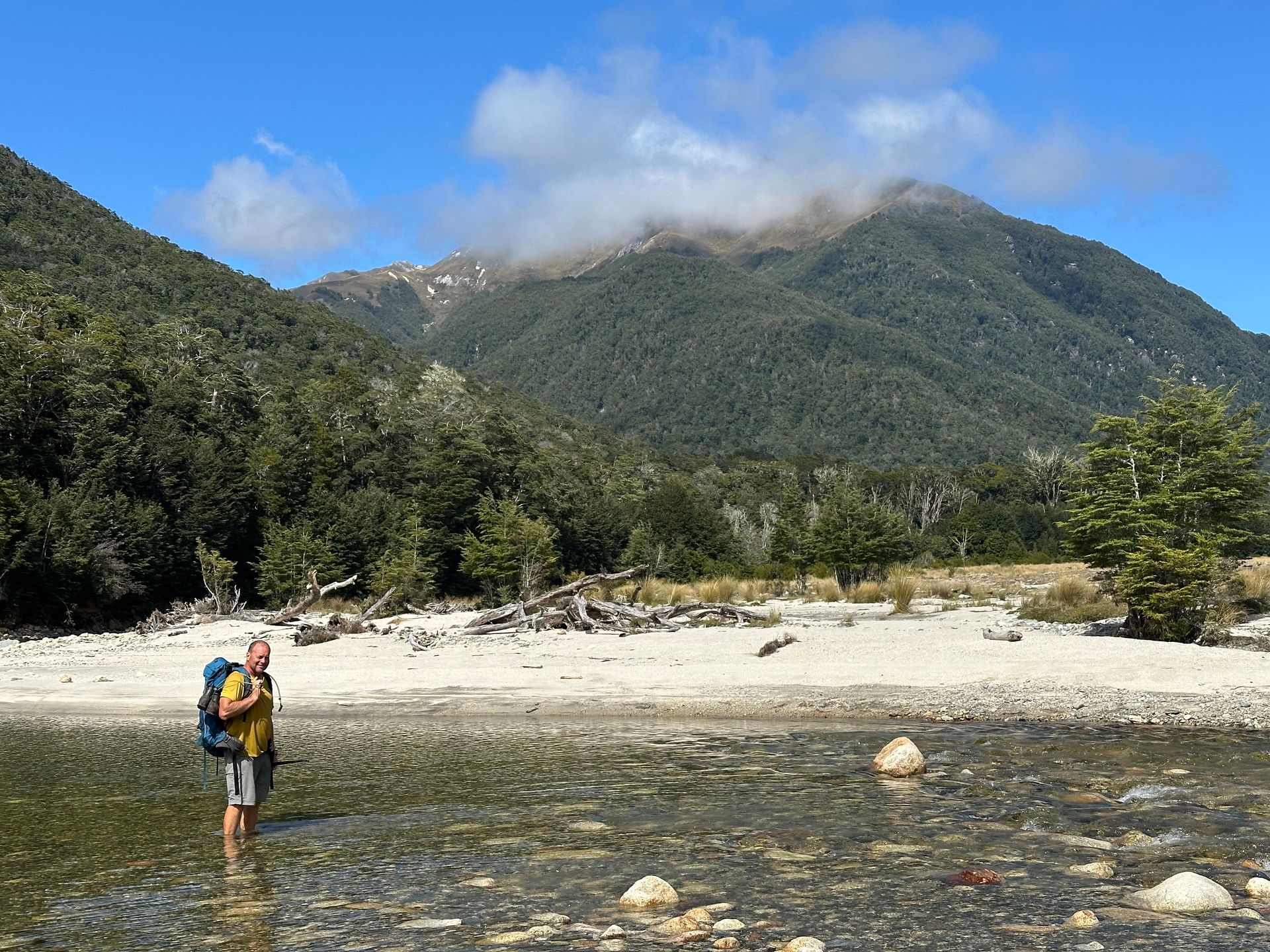 We cross the Garnock Burn wearing sandals, breaking my ‘Don’t take your boots off crossing a river when tramping,’ rule. My excuse is that the river is no more than calf deep, slow flowing and clear. And I don’t want wet socks and boots for the thirteen hundred metre climb on the other side of the river to reach the top of Mount Titiroa.