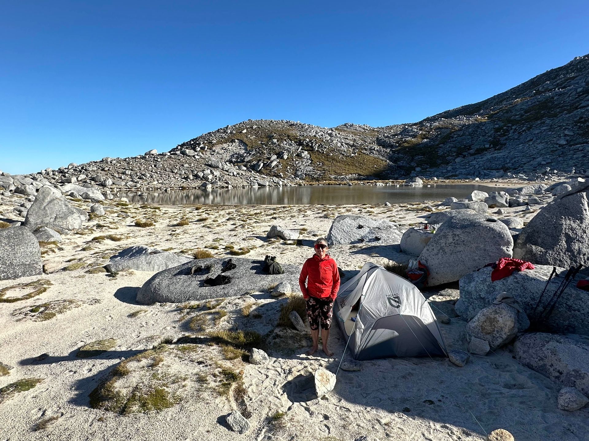 We stroll back down to Duffy Tarn, as we name it, on the basis that it is no more than knee deep compared to our deeper-than-you-can-see swimming spot. We traverse through Duffy Ridge, Duffy Creek, Duffy Swamp to Duffy Rocks where we put up our tent and make a cup of tea.