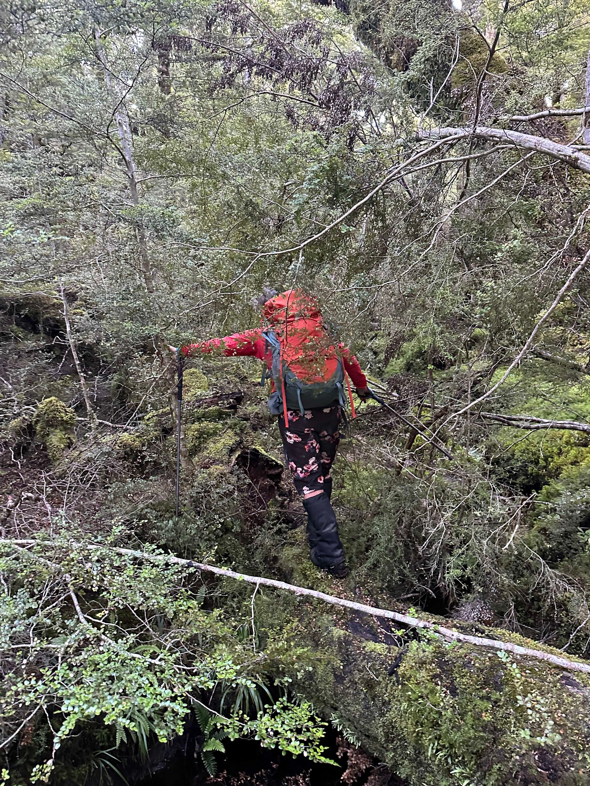 We had walked for a couple of hours on a track from Hope Arm Hut on Lake Manapouri to reach the Garnock Burn, climbing over and around fallen trees in the old growth beech and podocarp forest. On the other side of the Garnock Burn there is no track. As we walk into the bush I feel like I’m going home.