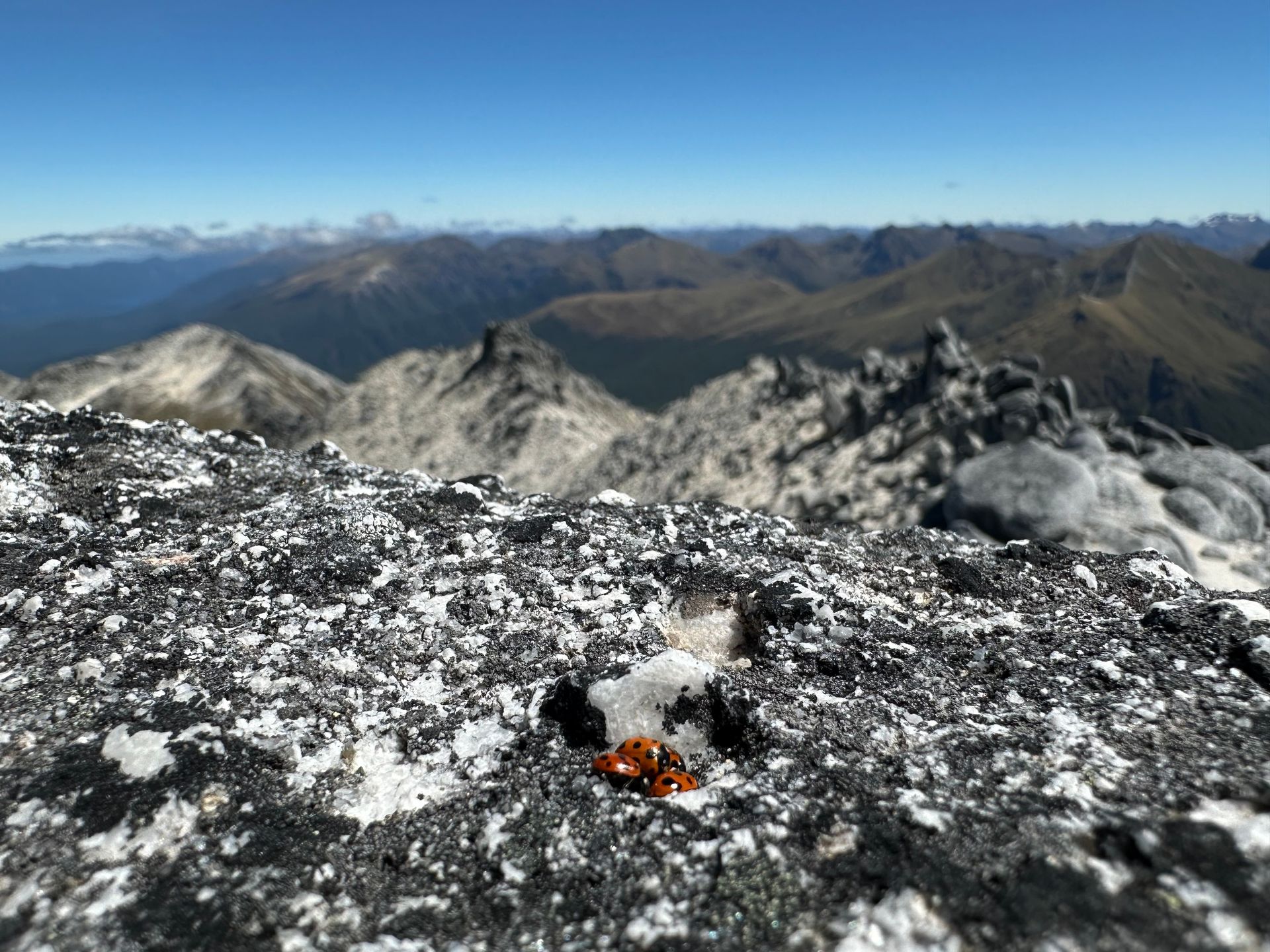 There’s a loveliness of black-spotted red ladybirds living in a tiny scoop on top of the summit rock.