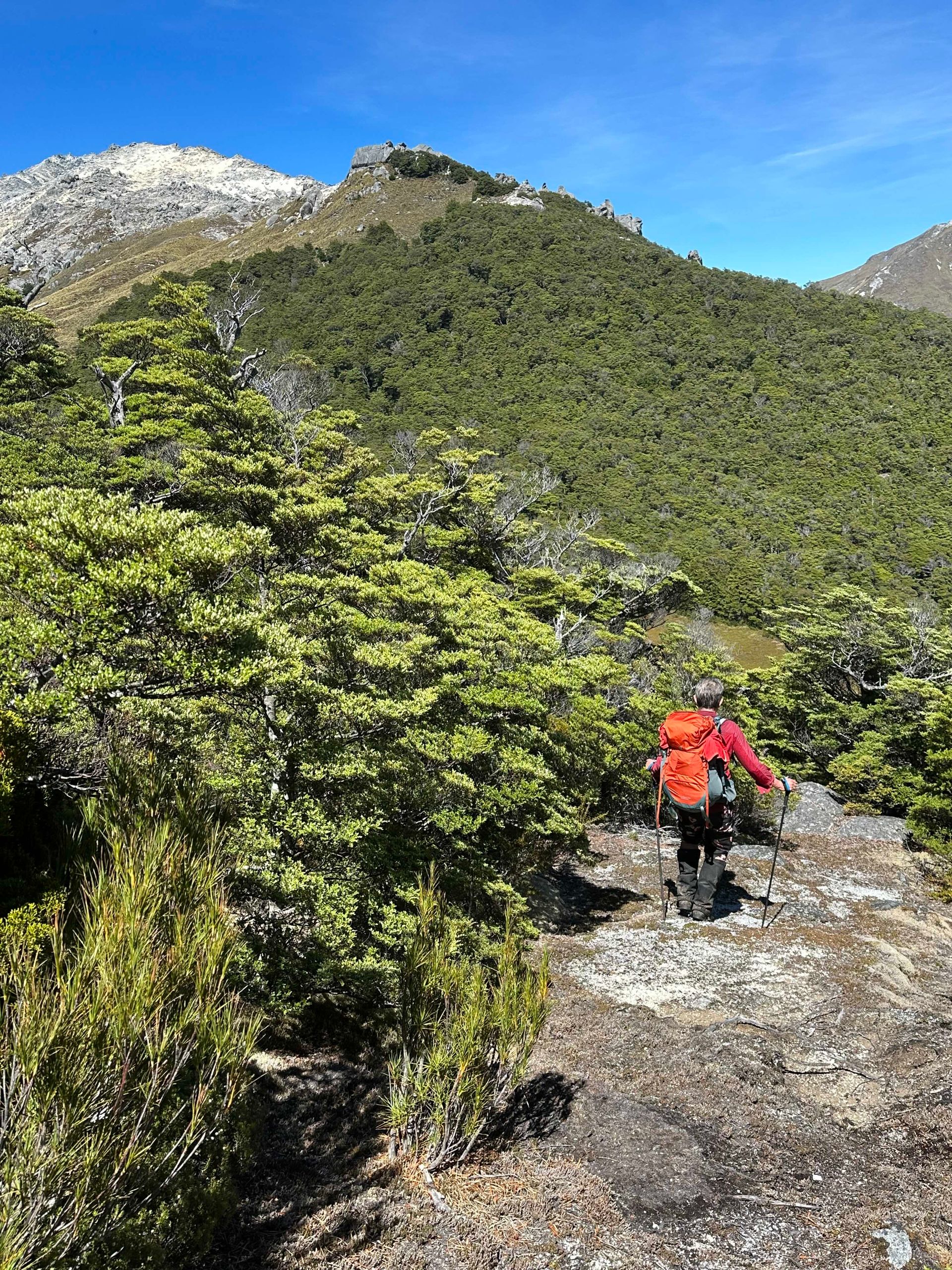 Climbing through the forest towards Titiroa feels right. We avoid dense patches of tree fall and head up the side of creeklets that incise into the slope. We skirt around small bluffs, having deliberately taken a line to the right of large bluffs towering above the river. Obvious routes appear through the vegetation and we follow them – more likely deer tracks than from human footfalls. We gain nearly four hundred metres of elevation in around six hundred metres of horizontal distance to a broad ridge along which there are many tracks through a tangle of trees and shrubs.