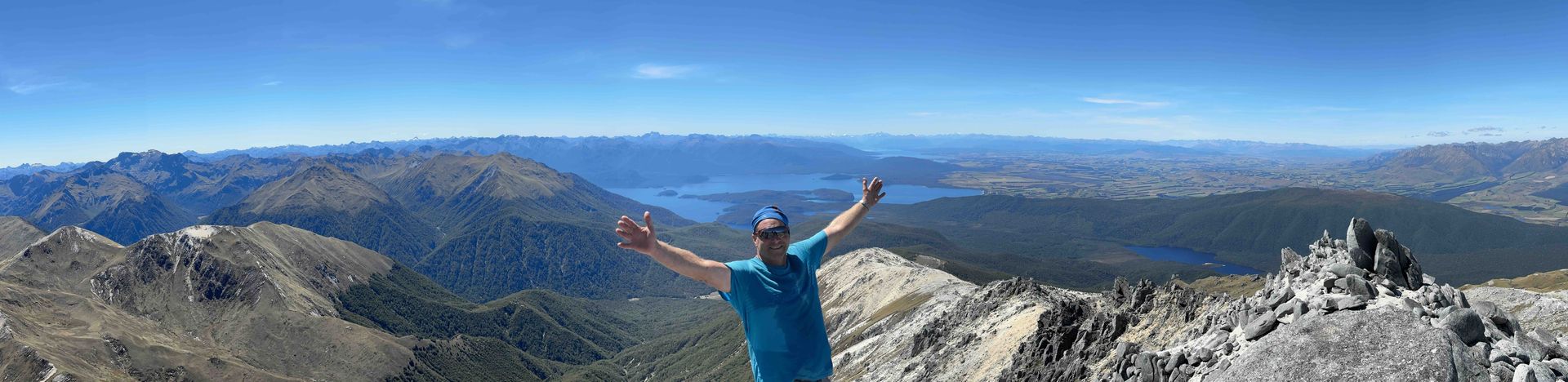 We climb the last three hundred metres to the peak at 1715m and views of Lakes Manapouri, Te Anau, Monowai. We can see Tutoko, Pikirakatahi – Mount Earnslaw, Tititea – Mount Aspiring and, we think, Aoraki – Mount Cook.