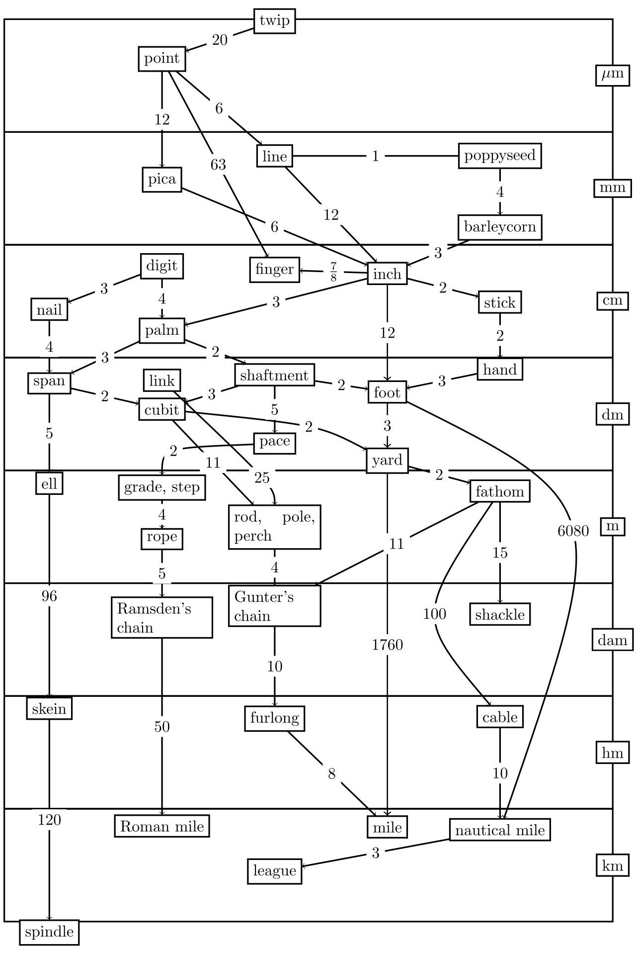 Less metrically, there are 1,140,480 twips (twentieth of a point) in a Gunter’s chain and you can calculate a twip by taking your US shoe size, adding 26 & dividing by 1/160.3 x the length of your foot in inches.