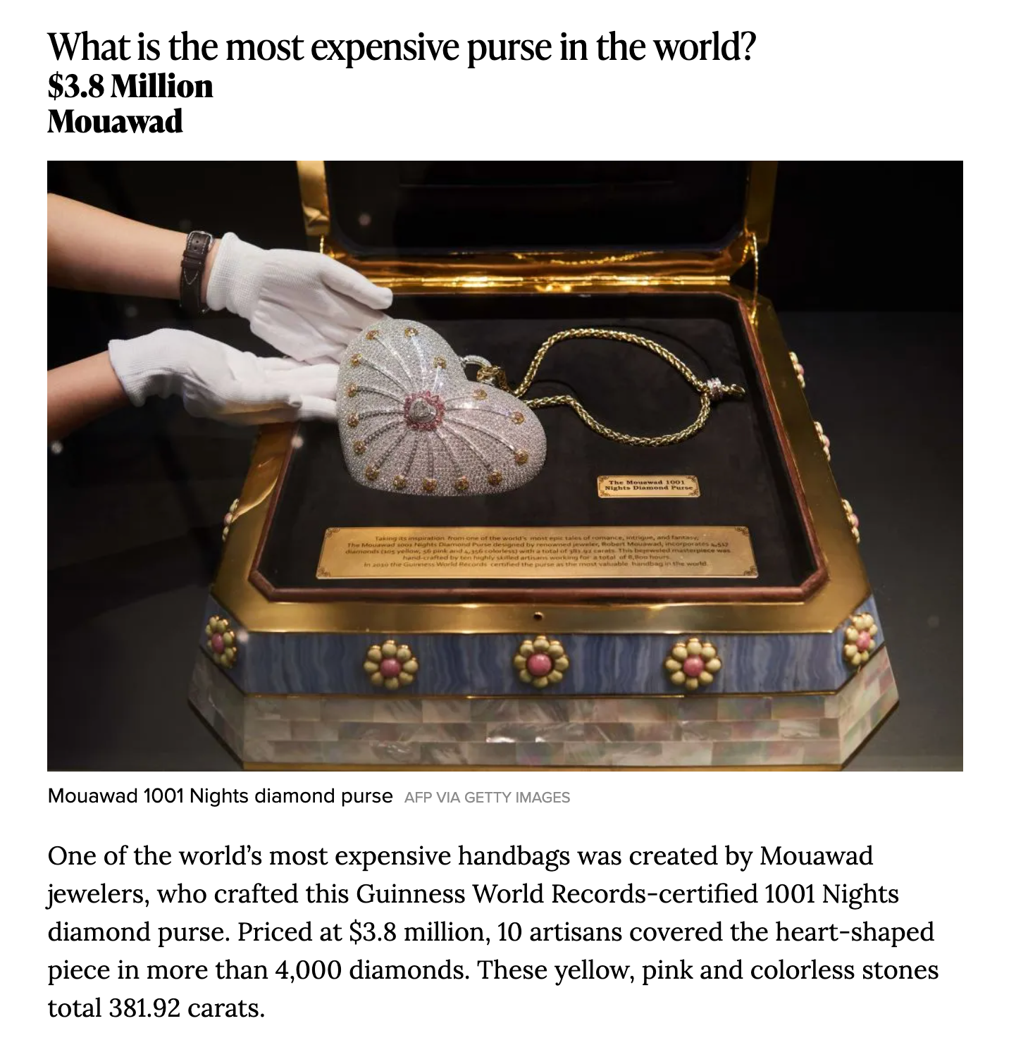 Handbags in the Mouwad league cross the divide between useful item and art piece, at which point there is no point in asking whether they are worth what people are paying for them. The handbags may or may not have a practical function – would you open a $3.8 million dollar handbag at the risk of dislodging a diamond? – but have far more significant function as status symbols, showing others how much the owner can buy.