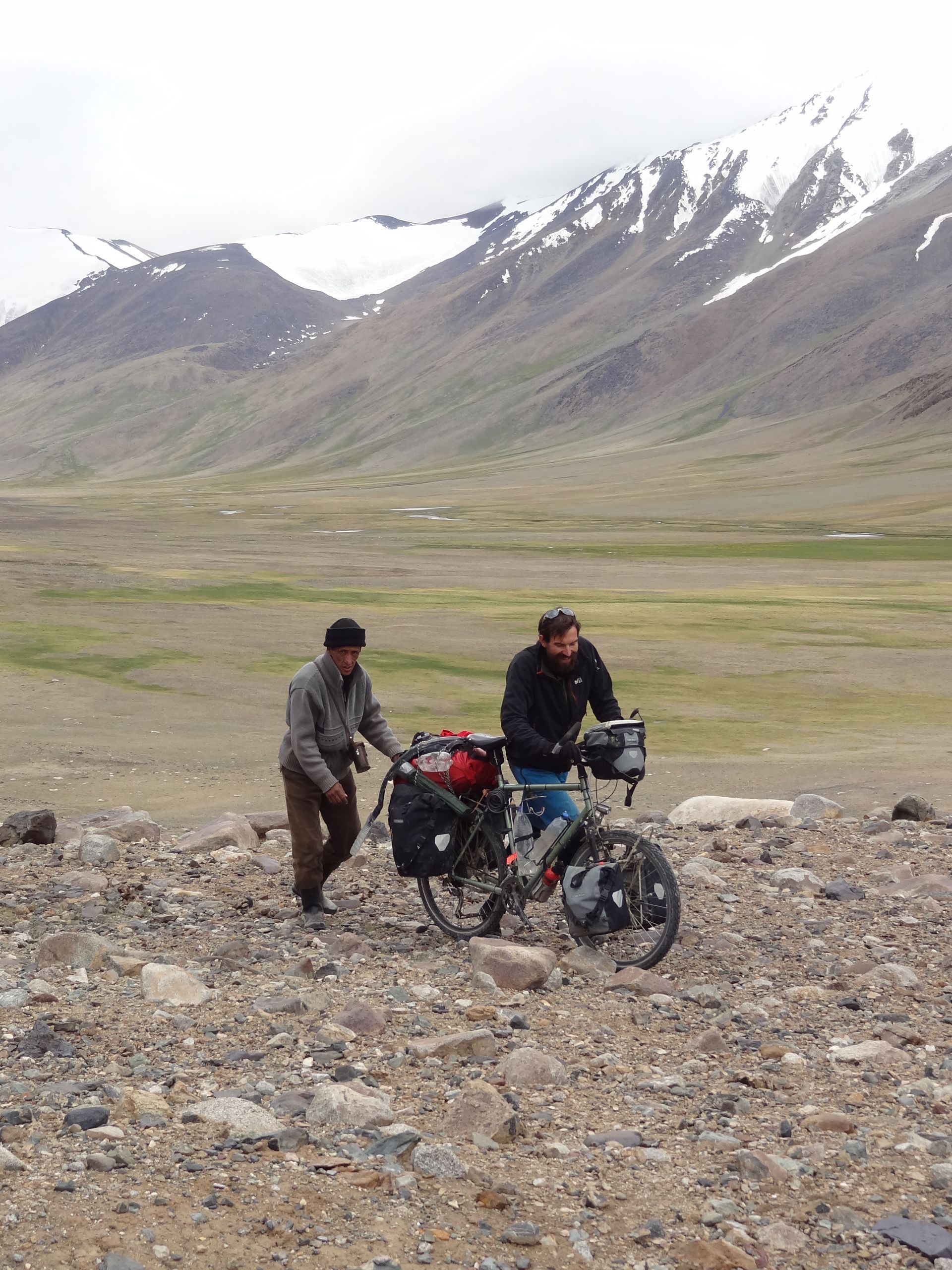 From the pass we look out to a wide floodplain several hundred metres below us. More brown and grey slopes either side of the floodplain taper up into snow capped by clouds. We can’t see the Dankai confluence – no clues yet on how deep the crossing might be. Chris and Michael leap on their bikes and take off down the slope, veering between rounded boulders. I yell, “Do you want to break your bike?”