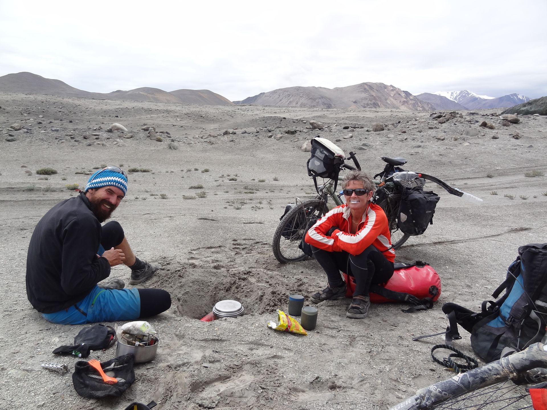 We load our bikes, ride some stretches and walk others as the surface varies between soft sand, soft gravel, and boulder fields. Vehicle tracks appear then disappear under the gravel. A wind rises in our faces and we burrow down in sandy hillocks to cook Chinese noodle soup for lunch; we need energy. I reapply zinc sunblock to my cracked lips; there’s no mirror in which to see how clownish I look.