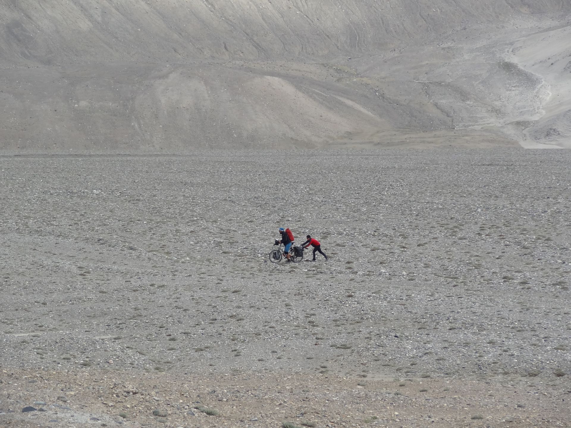 I storm, ridiculously, across the gravel in a right-slanted direction veering away from Chris. I push as hard as I can to leave him behind. I drop my bike, ignoring that Chris is on the tarmac a hundred metres away, and walk back to help Michael, who is a dot in the far distance because his heavy load is sinking into the sediment. I push as Michael tries to ride and Chris takes a photo of us from the road.