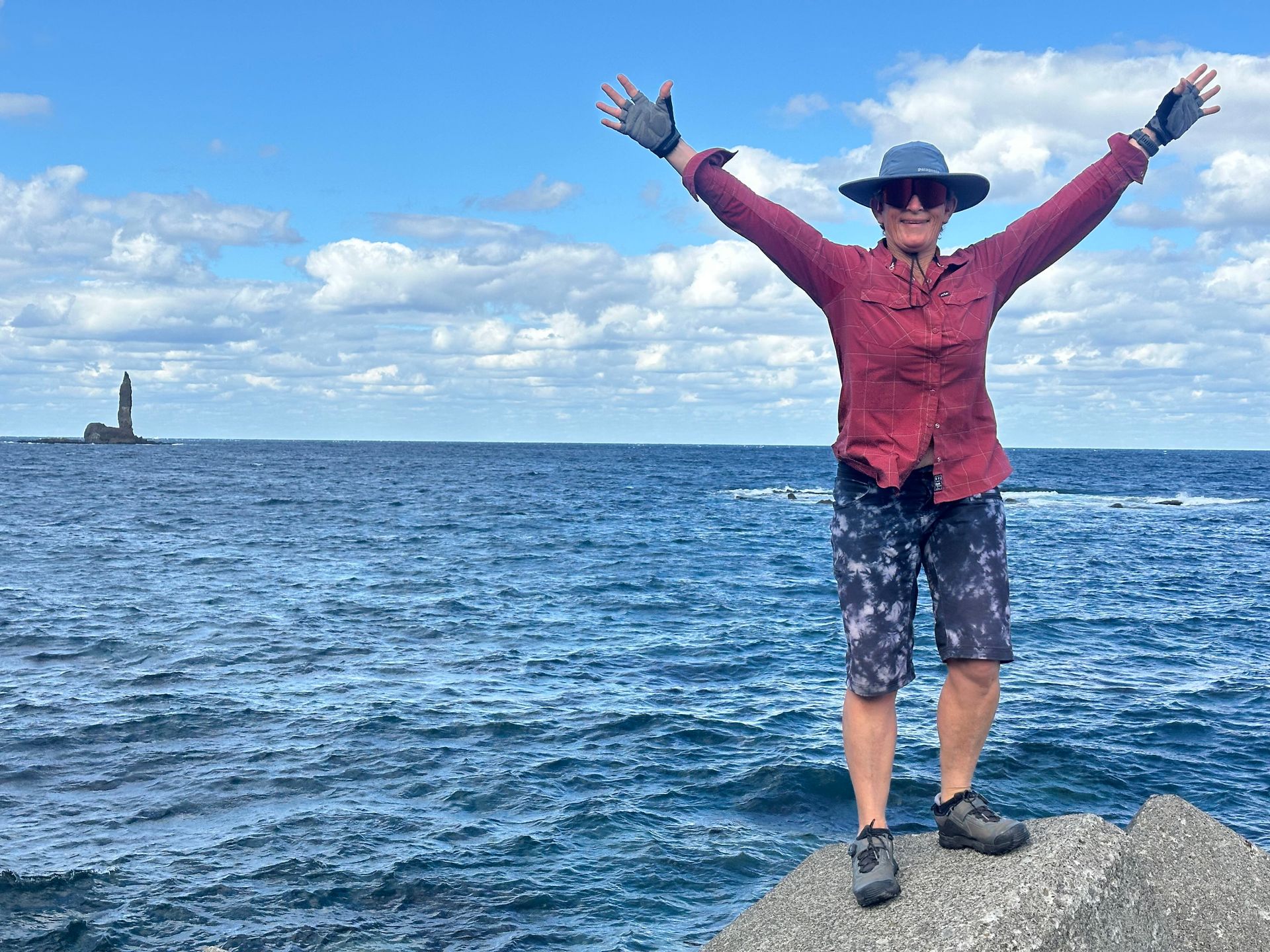 Jane & a sea stack on the west coast of Hokkaido, Japan.